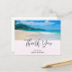 Tack-kort med ett fotografi av en fantastisk semesterplats. Ljusblå himmel, mjuk sandstrand med tropiskt kristallklart blått vatten. Ett frodigt trädbevuxen berg i bakgrunden. Naturskön och lugn fotografering.