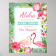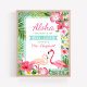 Bröllopsfest välkomstskylt / affisch med två vackra rosa flamingos med en frodig ram av gröna palmblad och tropiska hibiskusblommor i nyanser av hetrosa, solgul och vit. Stilfull Aloha-text med akvablå banderoll kan anpassas helt för ditt evenemang och den blivande brudens namn. Bakgrundsfärgen är sjögrön / grön.