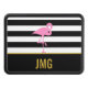 En rosa flamingo ligger på en svart och vit strimlad bakgrund. Under fågeln finns faux guld-text som du kan lägga till initialer (monogram) eller ett anpassningsbar-meddelande.