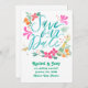Denna Save the Date har en livfull och lekfull akvarelldesign. Den handskrivna texten är skriven i fet turkos färg, omgiven av festliga element som ljusröda blommor, apelsiner, en champagneflaska och ett cocktailglas, alla målade i livfulla färger. De blomstermotiv och tropiska accenterna, i kombination med festliga bilder, ger detta kort en rolig och glädjefylld känsla - perfekt för par som planerar en livlig och uppåtstigande bröllopsfest.