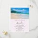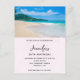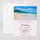 Födelsedagsinbjudan vykort med ett fotografi av en fantastisk semesterdestination. Ljusblå himmel, mjuk sandstrand med tropiskt kristallklart blått vatten. Ett frodigt trädbevuxen berg i bakgrunden. Vacker och lugn fotografering.