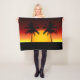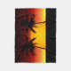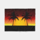 En tropisk kastfilt med en brännhet röd och orange solinställning bak två palmträdsilhouettes.