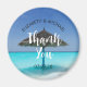 En tacksamhetsmagnet för bröllop med ett fotografi av en pittoresk tropisk strand på Maldiverna. En vit sandstrand och kristallblått vatten med ett ensamt taktäckt paraply. Avskild och lugn.