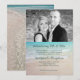 Endast mottagning bröllopsannons och inbjudan med strand / tropiskt tema. "Vi presenterar herr och fru" är den översta raden under det stora fotot av de nygifta. Blått havsvatten och strand sand bild är bakgrunden för stora manus och små versaler tryckta teckensnitt. Först, meddela datum och plats för äktenskapet, sedan inbjuda gästerna till mottagningen.