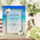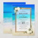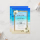 Tropiska bröllopsinbjudningar med sommar destination havsstrand, en elegant guld ram, enkla akvarell blommor och en modern brölloppsmall som är lätt att anpassa.