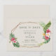 Be familj och vänner att reservera datumet för ditt strandbröllop med detta tropiska blommiga strandbröllop sparad datum. Dess underbara design fångar strandens skönhet med en elfenbensvit bakgrund med en kant av tropiska blommor och blad. Perfekt för ett stranddestinationbröllop!