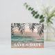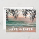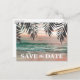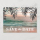 Stranddestination spara datum vykort med en tropisk palmmiljö, sladd med glödlampor och en modern bröllsmall.