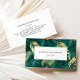 En affärskort med en mönster av barrträd och guld-djungelblad på en tealfébakgrund. Anpassa den med ditt namn och din titel i grått-text för kol i en vit rektangel. Lägg till namn, titel och kontaktinformation på baksidan.