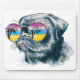 Denna design presenterar en mops som tittar till och med solglasögon på en tropisk plats.