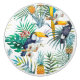Ett seamless mönster för härlig och kall sommar som presenterar tropiska vattenfärglöv med papegojor, tropiska fåglar och ananas i grönt, blått, gult och orange på en vitbakgrund. Tillfoga denna färgrika hawaianska tropikinspiration till din utomhus- dekor för partystrandtemat.