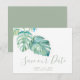 Meddela din förlovning med min tropiska spara datuminbjudningarna med Spara Vårt datum i ett trendig-skript, typografi stil som frammanar utseendet av handskriftsbokstäver. Det här enkla kortet har min ursprungliga vattenfärgsmonstera handflatan löv grönt med namn, bröllop och bröllop. Kort tillbaka till kompletterande solid sage grönt färg. Perfekt för tropiska bröllop Nycklar, Västindien, Hawaii och destinationsbröllop. Om du vill se motsvarande bröllop-svit besöker du DotellABelle på Zazzle.