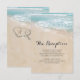 Bröllopsinbjudan för beach wedding med informationskort med sommar tropisk ö bakgrund, vintage sandstrand med två hjärtan i strandlinjen, era initialer och en textmall för bröllop.
