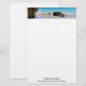 Stationär papper med ett scenfotografi. Vackert blått hav med sandstrand. Ett stort brunt sten ger lite skugga från det ljusa blå himmel.