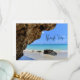 Tack för ditt kort med ett scenfotografi. Vackert blått hav med sandstrand. Ett stort brunt sten ger lite skugga från det ljusa blå himmel.