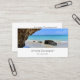 Affärskort med ett scenbildfotografi. Vackert blått hav med sandstrand. Ett stort brunt sten ger lite skugga från det ljusa blå himmel.