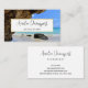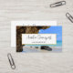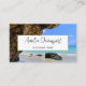Affärskort med ett scenbildfotografi. Vackert blått hav med sandstrand. Ett stort brunt sten ger lite skugga från det ljusa blå himmel.
