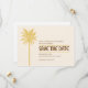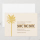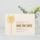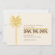 Off-vita, bruna och beige tropiska beach spara datum-kort med en palmdesign.