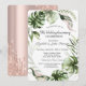 En modern, chic och glamourös design med glitterdroppar på en roséguld bakgrund och tropiska blad.