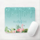 Modern Elegant och Trendig Teal Glitter Mouse Pad personlig med ditt namn och Monogram Initial. Att köra Glitter med gnistor. Innehåller tropisk Blommigt av vattenfärg, Löv och Rosa Flamingo.