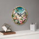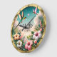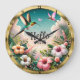 Den här cirkulära väggklockan har en vibrerande, lush-tropisk scen med två hummingfåglar på flyget mitt bland exotiska blommor och löv. En hummingbird, med grönt och blått plumage, är central, medan en mindre rosa en fladder i närheten. Orden "Hej där" är synlig i mitten, delvis fördunklad av klockan händer. Bakgrunden visar ett mjukt, glödande himmel som alla är inneslutna i ett gyllene, ribbat ram.