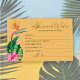 Denna färgstarka tropiska blommigt och den tropiska färg-bakgrunden inbjudningskort för möhippan. Konstruktionen har en vattenfärgad elegant buquet av klassisk strandvattenfärg, grönenergi och blommor, inklusive rosa hibiscus, orange och blåa fåglar av paradiset, grönt grey och mörk grönt handflatan löv.