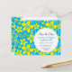 Ett sortiment av tropiska blommor i ljusa gulter överträffar lysande turkos för att göra den här perfekten för vykort för att tillkännage ditt tropiska bröllop eller destinationsbröllop. Den anpassade informationen visas i en vit cirkel. Mönster och cirkel upprepas i motsatt riktning. Finns i alternativ färg med matchande produkter.