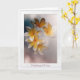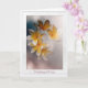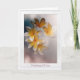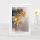 "Fem söt vita och gult hawaiiska blommor mot en grått suddig bakgrund för att visa sin skönhet. Gult och vitt bildar dessa ömtåliga blommor på ett sken av dig får ett bra kort. En vit ram runt kortet fyller i designen."