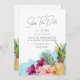 Den här eleganten tropiska temat sparar datumkortet med vackra botaniska vattenfärger med elegant men modern typografi. Det här är perfekten för att spara datumet för ett tropiskt öbröllop. Se samlingen för samordnande artiklar!
