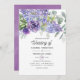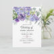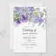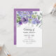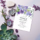 Trendigets bröllopsinbjudan med eukalyptus löv och sukulenta växter blandade med blommigtar i accenter av pastelllilak, lila och violett.