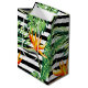 En medelstor presentsäck har tropiska fåglar av paradis, monster och banan-löv på svart och vit rand-bakgrund. Du får roligt med de här presentpåsarna i fyra storlekar. MATCHING-objekt i vår butik.