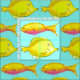 En fiskvävnad av roligt med en tropisk gult och soluppgång som dras med bläck och vattenfärg på en pastellturkos bakgrund. Du kan anpassa storleka för upprepningen av mönster och bakgrunden till infrastrukturens färg.