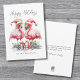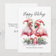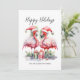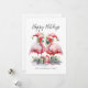 Tropiska God Jul Flamingo Julkort. God Jul! Lägg till en tropisk touch till dina säsongshelsningar med detta charmiga kort med två rosa flamingos i Santa-hattar, vända mot varandra i en söt och festlig pose, omgivna av färgglada julpresenter. Flamingos är centrerade på kortet, vilket gör det till en förtjusande design för par eller någon som älskar ett strandigt jultema. Ditt familjenamn eller personliga text visas elegant längst ner och knyter ihop allt. Med sin rustika akvarellstil och en blandning av avslappnad handskrift och enkel typografi ger detta kort en lekfull men elegant stämning. Perfekt för dem som bor i eller drömmer om tropiska platser som Florida, Hawaii eller Bahamas, finns denna design tillgänglig som ett tryckt kort eller en digital nedladdning för e-post eller lokal utskrift. Ett