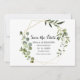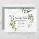 Denna inbjudan till den tropiska grönten löv bröllop spara datum är perfekt för ett enkelt bröllop. Utformningen har handmålade vackra löv för grönt, som lägger till ett guld-geometriskt ram.