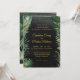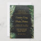 En elegant vattenfärgsmålad tropiska bröllopsinbjudning med en dramatisk svart vattenfärg tvättar bakgrunden med höggradigt målade grönt handflatan löv och skuggande accenter från guld. En kalligrafi med ett livligt guld-bytesskript ger information om bröllop.