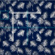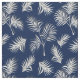 Tropiskt tryckt tyg med mönster i vit handflatan löv på midnattblå bakgrund.