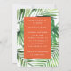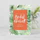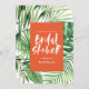 Den moderna tropiska handflatan-löv-möhippan inbjudan. Handmålad skripttext. En del av en sommarinsamling av trender. Bakgrunden till färg kan ändras.