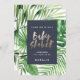 Moderna tropiska babyduschinbjudningar till handflatan löv-vattenfärgsbladet. Handmålad guld-effektskripttext. En del av en sommarinsamling av trender. Bakgrunden till färg kan ändras.