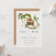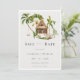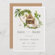 Denna inbjudan från bröllop spara datum är en tropiskt djungelmönster med naturens färg. Den har handflatan träd, lustiga regnskogar och bungalows inneslutna i ett vackert tropiskt paradis.