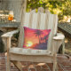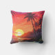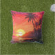 Utomhus dekorativ kudde med bilder av tropiska handflatan träd på en strand med sol i färg på rosa, grönt och gult.