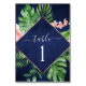 Den tropiska Grönten Handflatan Löv och den Rosan Flowers Watercolor med Faux Ro Gold Foil Geometric form och Navy Blue Background Vår eller Summer Wedding Reception Bordsnummer - omfattar vacker och elegant manustypografi med moderna tropiska botaniska blommor och grönenergi för den speciella Bröllopsdagen firande.