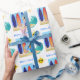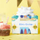 Surfer Beach. Anpassningsbarnas ordalydelse. Detta visar en rad teckning som har en surfbräda med handflatan träd på den och står upprätt i sanden bredvid en inkommande havsvåg. Två surfingbrädor till lämnat i olika färg med blå himmel-bakgrund. I hörnet finns en coola funky sol, med ett lycklig som leker ansikte och bär sina höftsolglasögon.God jul är skrivet i himlar blå. För alla strandar älskare, surfer, surfare eller surfande fläkt. Surfans upp! Du kan ändra eller radera ordalydelsen för att lämna oformaterad.