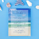 Denna vackra strandbröllop dryckesmeny har en fantastisk bild av havsvågorna för ett evenemang på destinationen. Vacker strandfotografering i kombination med elegant vit och blå typografi skapar en chic, modern barmeny för din tropiska ö-fest eller kustluau.