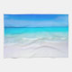 En kökshandduk med en sandig tropisk strand. Ett fantastiskt turkoshavet i avstånd och kristallklart vatten som bär på en sandstrand. En ljus blå himmel i bakgrunden.