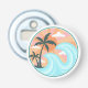 Enkelt bläckfisköppnare i flaska med färgstark roligt Illustrationsbild av grönt träd, blått vinkart, orange sol och handflatan och gult solstrålar på en faux rosa bakgrund kork struktur mönster. Omavrundat av ord relaterat till sommartid.. Vågar, Beach Party, Good Vibes, Cocktails, Summer, Friends, Laughn, Sol och Surfa. Coola flaska-öppnare för använda under badstranden eller på bakgården party och för att ha hand om din patient eller poolside tiki pub.