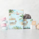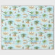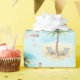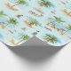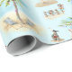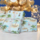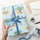 Denna pappra återtropiska julomslutning har en mönster av strandscener i helgdag med handflatan träd dekorerad med färgstarka strängar ljus och strandstolar som ser förbi vatten, som är sammanflätade med rosa flamingos i tomter och fiskmås på dekorerade pilar, på ljusblå bakgrund.