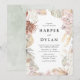 Elegant, moderna inbjudningar till tropiska bröllop som innehåller dina bröllop-detaljer som ramats av en gräns av vattenfärgblommor och tropisk löv i jorda nyanser av rosa, tan, beige, rost, brun, sage och mörk grönt. Den tropiska bröllopsinbjudningen går tillbaka till en grönt vattenfärgsbakgrund.