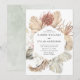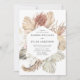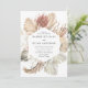 Elegant, moderna inbjudningar till tropiska bröllop som innehåller dina bröllop-detaljer som är ramade av en gräns av vattenfärgblommor och tropisk löv i jorda nyanser av tan, beige, rost, brun, sage och mörk grönt. Den tropiska bröllopsinbjudningen går tillbaka till en grönt vattenfärgsbakgrund.