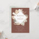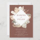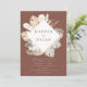 Elegant, moderna inbjudningar till tropiska bröllop med bröllop namn omgivna av en kvadrat ram av vattenfärgblommor och tropisk löv i vita, bruna, beige, rost, bruna, sage och mörk grönt nyanser. Anpassa inbjudan genom att lägga till informationen om bröllop nedan i vit text mot brunt bakgrund. Den tropiska bröllopsinbjudningen går tillbaka till en grönt vattenfärgsbakgrund.
