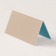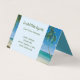 Tropical handflatan träd stående visitkortsmall. Handflatan träd och blått hav vatten är bakgrundsscenen för grönt text som skrivs ut över en blek blå panel. Kortets baksida är en sandbild och den underliggande är havsblå.