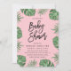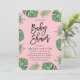 Inbjudan gäster till en sommarbarndusch med tropiska inbjudningskort för babydusch. De moderna inbjudningskorten för babydusch har en rosa bakgrund, ett snyggt-penselskript och tropiska löv som gränsar till inbjudan.
